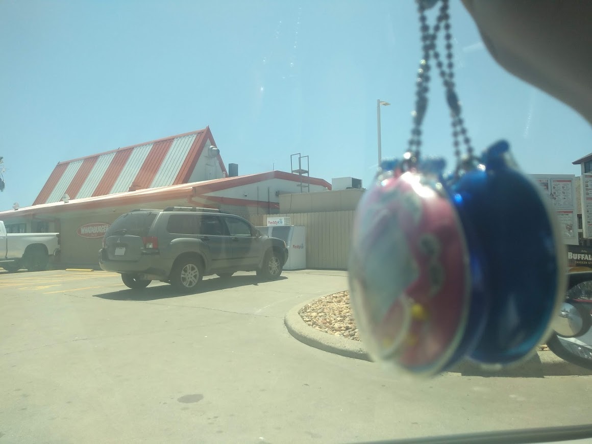 12:44PM: Since it's lunchtime, Brittany asked if I could grab us some food from Whataburger. If you aren't from Texas, you are missing out; and if you ever visit Texas, Whataburger is a must-see restaurant! Their burgers are delicious and it's an awesome fast-food burger place. Anyway, I hopped in the car and left for Whataburger while Brittany kept our spot at the beach. While waiting in the Whataburger drive-thru line, I took some pictures of the Tamas. This will be their first time eating Whataburger so I HAD to get a pic!